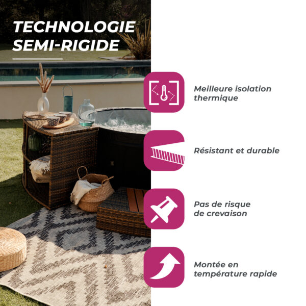 Toute l’année dans mon spa semi-rigide Place au relâchement Faites le choix du Vita. Sa structure semi-rigide composée de parois en mousse dense procure ce sentiment de sécurité. Insérées dans un revêtement premium avec une finition extérieure en PVC tressé, celles-ci confèrent au spa une excellente capacité de résistance. Il n’y a pas de saison pour la...