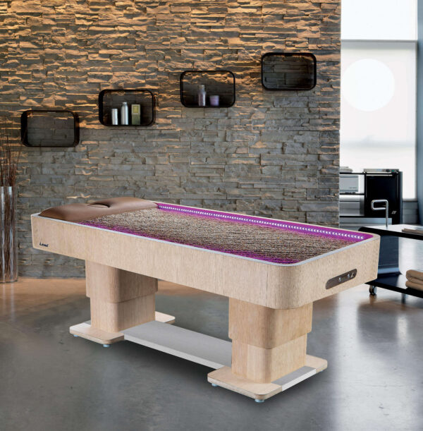 Doté d’un système de chromothérapie à 7 couleurs alternées, Spa Dream est fourni sur un support réglable en hauteur avec mouvement d’inclinaison. Le sable est composé de quartz sphérique et, lorsqu’il est chauffé, il enveloppe le corps, favorisant une relaxation intérieure complète. La chaleur est “sèche” comme celle de la plage marine et la granulométrie du sable favorise un bon support pour effectuer le massage. Alternativement,...