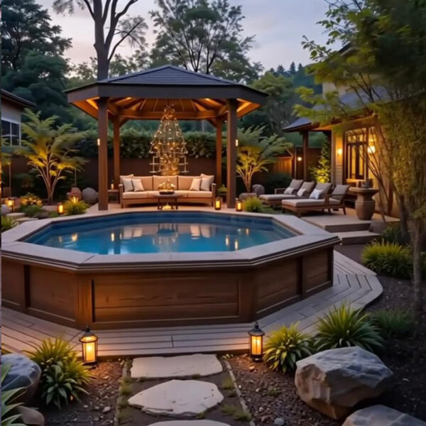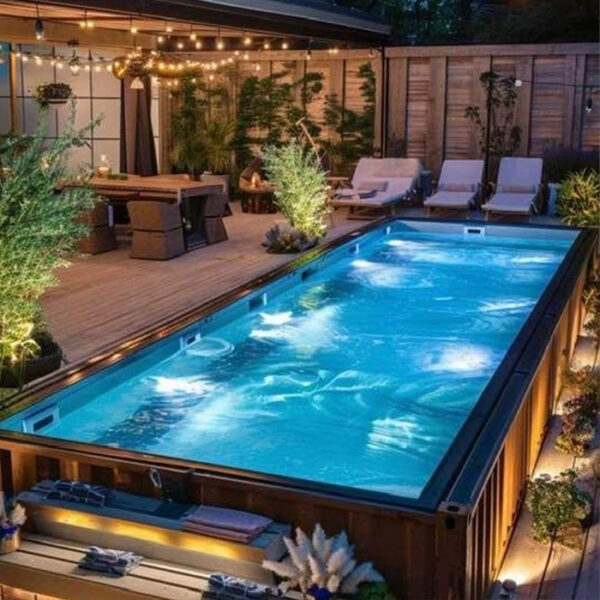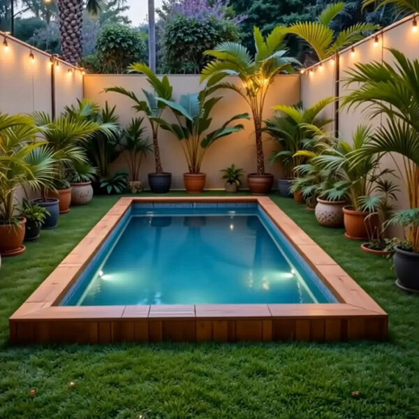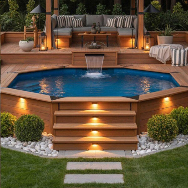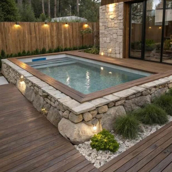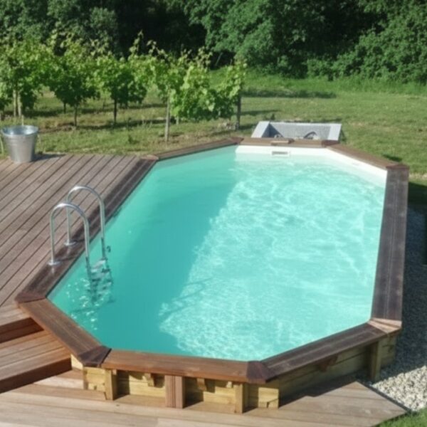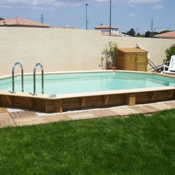 Composition: • Bastaings d’épaisseur 68 mm. •Tiges filetées et anneaux galvanisés. • Echelle inox ou escalier intérieur bois en fonction des piscines. • Margelles bois en option, en Pin classe 4 (finition saturée ambré), 36 x 295 mm, rainurées et de forme arrondie, vissage par dessus, liaison dans les angles par dessous. Equipements : •...
